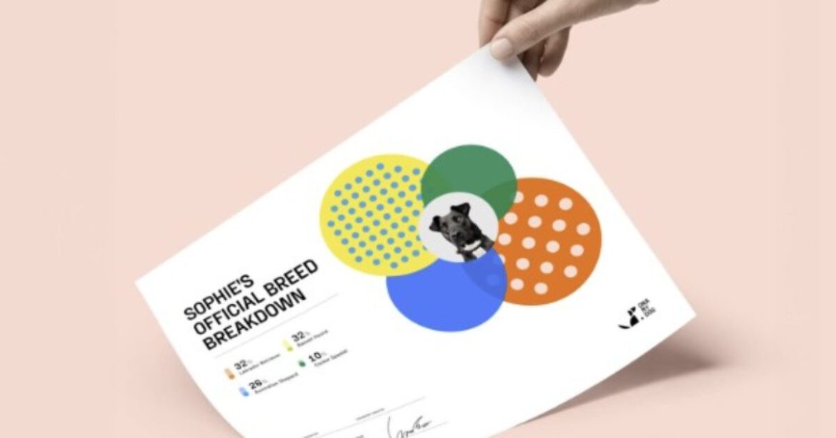 Hand holding a colorful certificate titled "Sophie's Official Breed Breakdown," featuring breed percentages and a photo of a dog, against a soft pink background.
